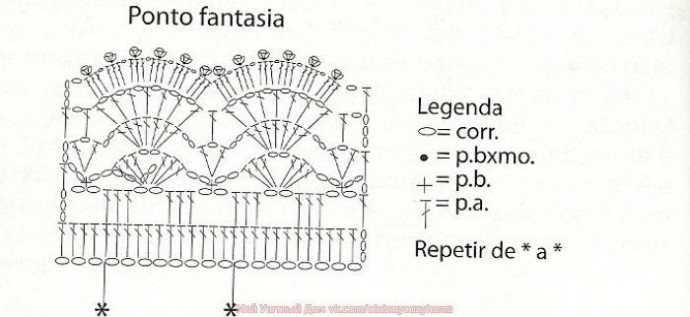 (Еще вариант - 2-ой ряд: 3 возд. петли, столбики с накидом до конца ряда.) Тогда поворачиваем работу и обвязываем фантазийным узором по схеме (низ воротничка).