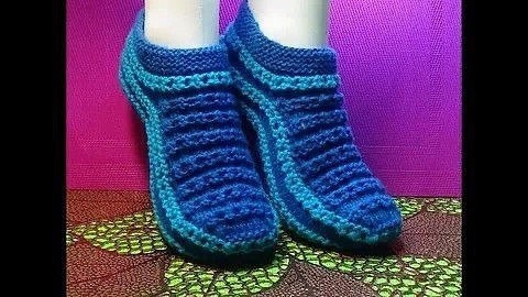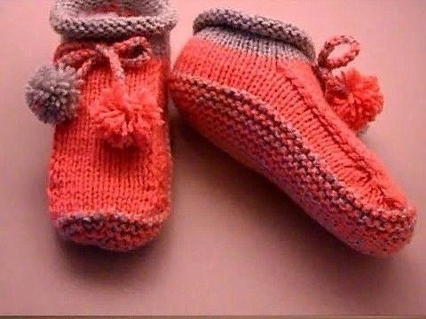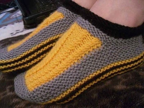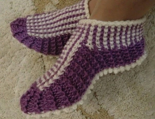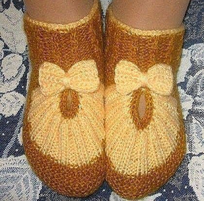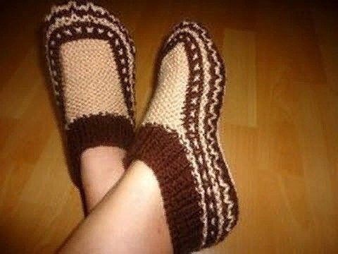Набрать на спицы 51 петлю тёмной нитью, провязать 8 рядов платочной вязкой. Затем разделить все петли на три части: 17+17+17, и вязать только среднюю часть чулочной вязкой. Боковые петли временно снимаем на большие булавки. Провязав 10-12 см, у нас получится прямоугольник. Петли не закрываем. По бокам прямоугольника набираем дополнительные петли (примерно 23-25) нитью светлого цвета. Вывязываем "зубчики" по трём сторонам прямоугольника: 4 ряда вяжем чулочной вязкой, 5 ряд - кромочную петлю снять, *2 петли вместе лицевой, накид* - до конца ряда. Ещё провязываем 3 ряда чулочной вязкой. Складываем вязание по тому ряду, где у нас накиды и соединяем начальный ряд с последним путём вывязывания: 1 петля с первого ряда и одна петля с последнего ряда провязать вместе лицевой. Затем подключаем в работу петли с булавок и вяжем платочной вязкой высоту тапочка 3-4 см тёмной нитью. Переходим на вязание подошвы.Для этого отметим средние 12 петель и вяжем их укороченными рядами, пока не закроем все боковые петли. Для вывязывания пятки по краям набираем высоту тапочка с двух сторон по 16-18 петель. Вяжем укороченными рядами средние 12 петель как пятку в носке. Верх тапочек обвязать "зубчиками". Подшиваем иглой. Готовые тапочки можно украсить по желанию. Начинаем вязать сверху зубцы (первым цветом), набираем 50 петель и вяжем 5 рядов чулочной вязкой, 6 ряд-1 кромоч. *накид, 2 вм.лиц.*, 1 кром. Потом опять 5 рядов чулочной вязкой После подшиваем зубцы спицей Затем 3 платочной вязкой вторым цветом После делим петли на три части и вяжем только среднюю часть Переходим на первый цвет и набираем кромочные петли средней части для вывязывания зубцов. Зубцы вяжем сверху: 4 ряда-чулочной вяз.; 5 ряд-1кром., *накид, 2 вм.лиц., *1 кром., потом опять 4 ряда чулоч.,вязкой После подшиваем зубцы спицей Затем вторым цветом на всех петлях башмачка вяжем платочной вязкой 1,5-2 см (полнота башмачка). Снова вяжем первым цветом зубцы - 4 ряда чулочной вязкой, 5 ряд - 1кром., *накид,2 вм.лиц.*, 1 кром., после опять 4 ряда чулоч. вязкой. После подшиваем зубцы спицой. Переходим на подошву которую вяжем вторым цветом платочной вязкой когда начинаешь вязать подошву. нужно убавлять в каждом втором ряду первые две петли вместе..потом две вместе перед центральной петлёй..провязываем центральную петлю и опять две вместе и две последние вместе Набрать на спицы 51 петлю тёмной нитью, провязать 8 рядов платочной вязкой. Затем разделить все петли на три части: 17+17+17, и вязать только среднюю часть. Боковые петли временно снимаем на большие булавки. Среднюю часть можно украсить любым рисунком. Например "бабочки". Вязание спицами узор бабочки. Для узора бабочки количество петель должно делиться на пять, плюс еще две петли. Для образца набираем 27 петель. Первый ряд вяжем лицевыми петлями. Второй и все четные вяжем изнаночными петлями. Третий ряд вяжем следующим образом: первую кромочную петлю снимаем, нитку отводим к себе и снимаем пять петель. Нитка должна лечь поперёк снятых петель вдоль левой спицы, затем вяжем пять лицевых петель и так вяжем до конца ряда. Последнюю кромочную петлю всегда вяжем лицевой. Точно также вяжем пятый, седьмой и девятый ряды. В одиннадцатом ряду вяжем бабочку. Вяжем две лицевые петли, затем правую спицу вводим под нити, лежащие на петлях, снизу вверх, захватываем рабочую нить, протаскиваем её под нитями, полученную п