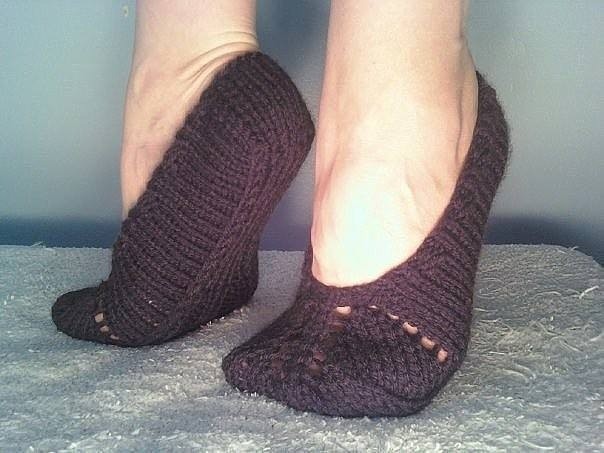 Провязать 25 лиц, еще 13 лиц (это ширина подошвы) и две петли вместе лиц. Перевернуть вязание. Первую петлю снимаем, 12 изнан, 2 вместе изнан. Перевернуть вязание. 26 лиц, 13 лиц, 2 вместе лиц. Перевернуть вязание. 1-ю снять, 12 изнан.. 2 вместе изнаночной. Убавляем петли как обычно вывязываем пятку у носка. Убавлять таким образом, пока все петли не закончатся и не останется только 14 петель стопы. Теперь набрать остальные петли по высоте следка и закончить работу так-же, как вывязываем пятку. Не забываем, что мы начинали работу резинкой 1 на 1. Как остались у нас 3 петли на правой спице - вяжем снова резинку 1 на 1. По изнанке последний ряд не провязываем, а закрываем петли - у нас нитка начала работы встречается с ниткой конца работы. Кончики связать и заправить на изнанке. Готово! Как мы научились вязать вариант попроще, теперь будем делать убавки на стопе, чтобы следок в любую обувь полез, когда на ногах только одни капроны. На правой спице осталось 13 (17) п - убавить на стопе 4 петли: 2 вм, 1 л, 2 вм, 1 л, 2 вм, 1 л, 2 вм, 1 л. И через пару лиц рядов еще убавить сбоков на стопе 2 петли. Вариации на тему: стопу можно вязать не только лицевыми, можно и чулочной вязкой. Или рисом 1 на 1. Убавки можно "запрятать" в резинку. Можно после резинки вывязать дырочки для шнурочка. Можно по изнанке сделать кантик из лицевых петель, в образце эта деталь есть. Получается на лице "бортик".
