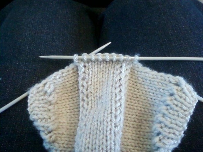 Провязать 15 п лицевыми, 1 накид (можно лдицевую скрещенную - тогда дырочек не будет), 2 лиц, 1 накид,снова 25 лиц. Изнанку - по рисунку. Накиды провязать изнаночными. Прибавки будут в 6-ти лиц рядах. 26 лиц, 1 накид, 2 лиц, 1накид, 25 лиц и последнюю петлю изнаночной. след. ряды: 27-1-2-1-27, 28-1-2-1-28, 29-1-2-1-29, 30-1-2-1-30. Теперь будем вязать подошву.
