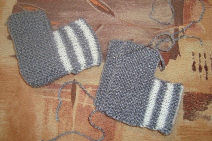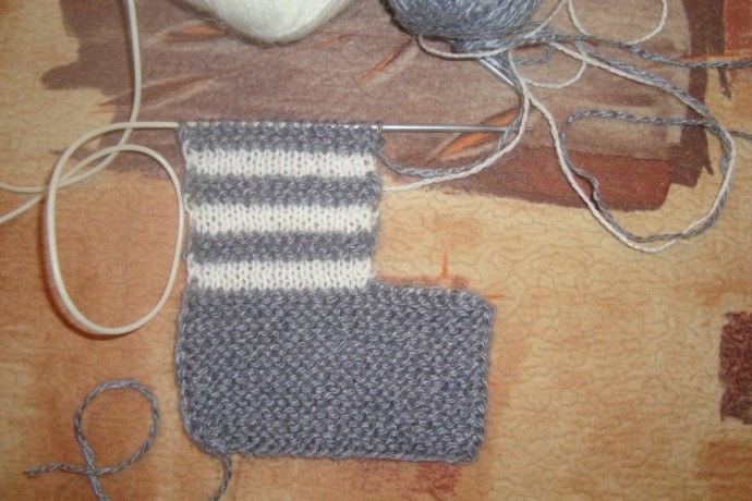 Затем с лицевого ряда закрываем первые 8 петель и продолжаем работу только на 16 петлях. Здесь рисунок нужно чередовать : 4 ряда чулочной вязки ( белая пряжа) ,затем 4 ряда платочной вязки ( серая пряжа).