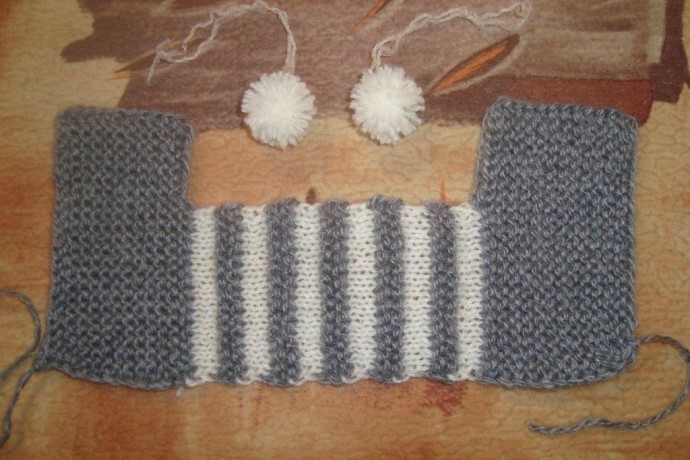 Чередование полос : 6 раз белая и 5 раз – серая полоса. Затем обычным набором петель добираем недостающие 8 петель полотна и продолжает работу однотонной пряжей – 24 ряда, как и вязали в самом начале.