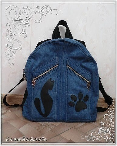 4. Берёмся за кармашки: вшиваем молнию и пристрачиваем аппликацию, используя кусочки кожи или другой какой-либо материал (лучше с неосыпающимися краями). Вот где простор для творчества! У меня душа легла вот к этой замечательной киске. А можно пойти более простым путём - взять готовую аппликацию, котрыми в изобилии радуют магазины для рукодельниц.