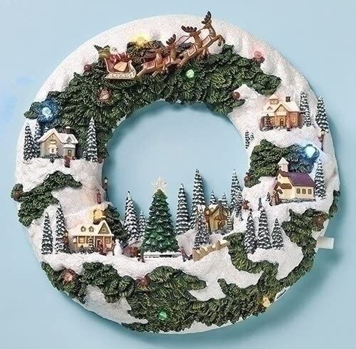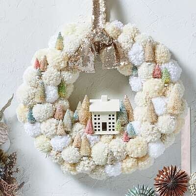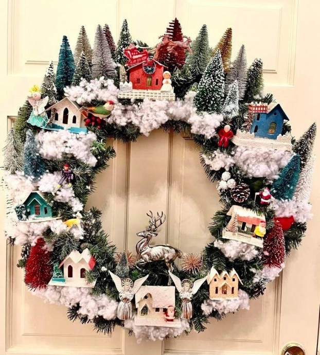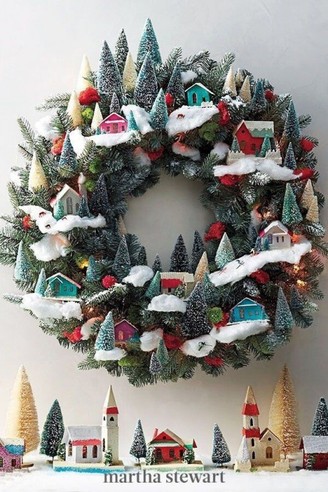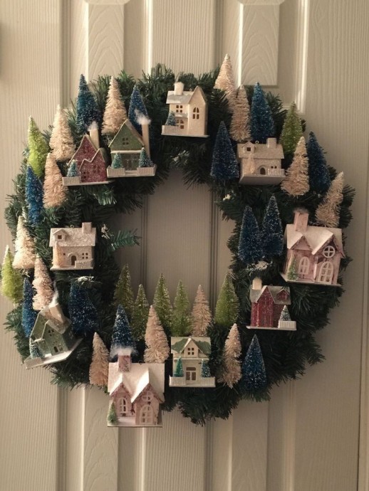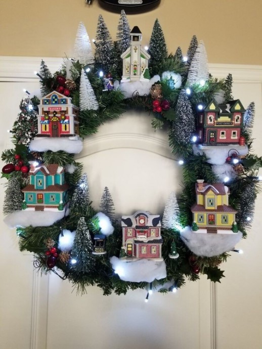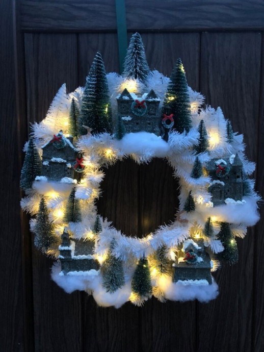 Новогодние венки с домиками это целые зимние пейзажи, которые радуют глаз.