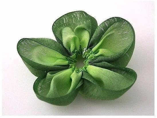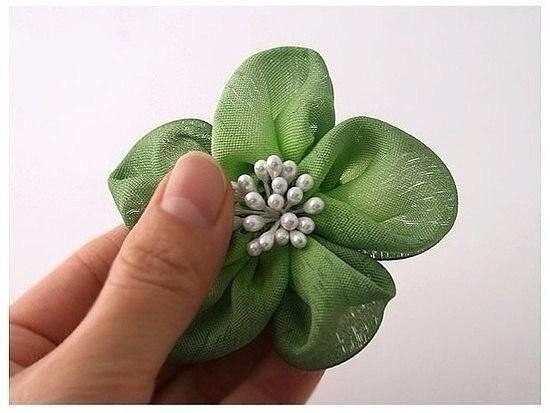 Цветок из ленты с бусинами по центру это изысканное украшение для тех, кто готов обращаться с ним в дальнейшем достаточно бережно.