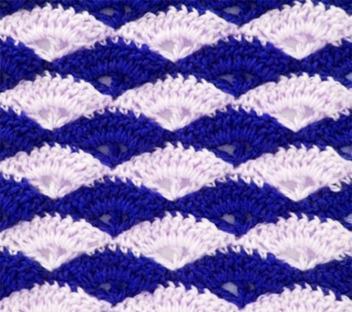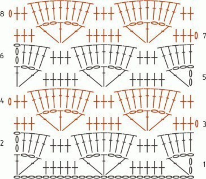 Узор связан крючком из мягкой шерстяной пряжи двух контрастных цветов. Для образца узора набирают число петель кратное 12, плюс 6 петель.Узор представляет собой "ракушки", связанные на основании из 3-х столбиков с 1-им накидом. "Ракушки" чередуются в шахматном порядке. Для сокращения записи узора, разберем, как вяжется основание и как вяжется ракушка.