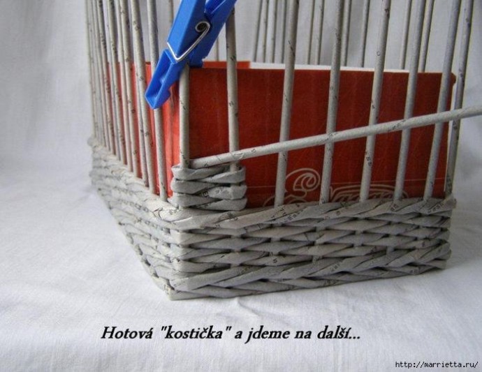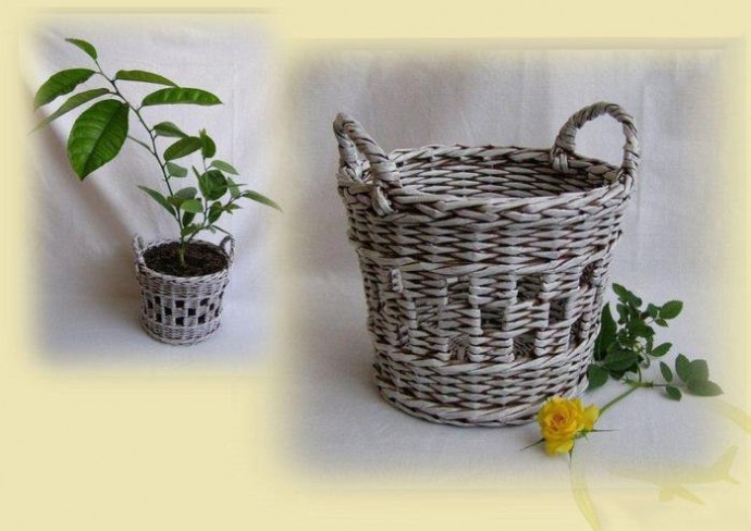 Корзина из газетных трубочек выполнена в технике шахматки.