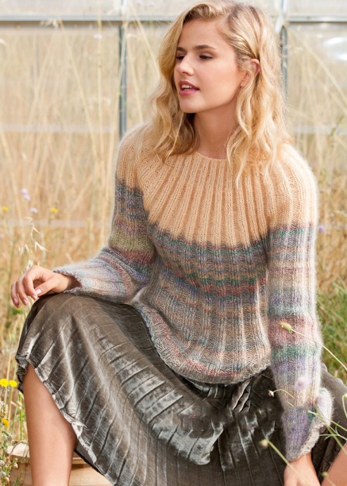 Круглая кокетка: на спицы № 5 перевести оставленные петли деталей: 64 (72 – 80 – 86) п. первого рукава, 80 (88 – 96 – 104) п. переда, 64 (72 – 80 – 86) п. второго рукава и 80 (88 – 96 – 104) п. спинки = 288 (320 – 352 – 380) п. Петли рукавов включить на участке резинки из 4 лицевых петель по центру, т. к. рукав начинается и заканчивается 2 лиц. Вязать резинкой по кругу в 2 нити (= по 1 нити обеих пряж, взятые вместе) 26 (29 – 33 – 38) рядов. Затем перейти на спицы № 4,5 и вязать 20 рядов двойной нитью пряжей 2. Перейти на спицы № 4 и связать еще 8 рядов. После этого работу продолжить одиночной нитью пряжей спицами № 3,5, выполнить 19 рядов и в следующем ряду = 24 (25 – 26,5 – 28) см от начала кокетки петли закрыть спицами № 4 тройной нитью пряжей 2, провязав по 3 п. вместе изнаночными.