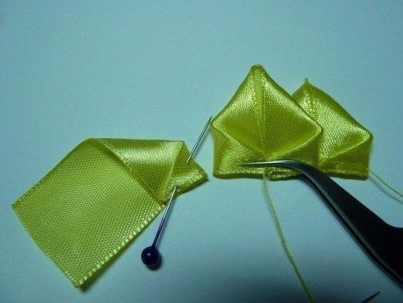 Роза в технике канзашиМатериалы: лента атласная, ножницы, иголка, нитки, пинцет, спички, свечаПроцесс:Отрезаем 5 см от ленты (так, чтобы получился квадрат) и оплавляем края.Складыв...