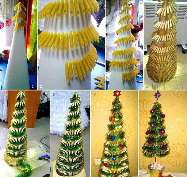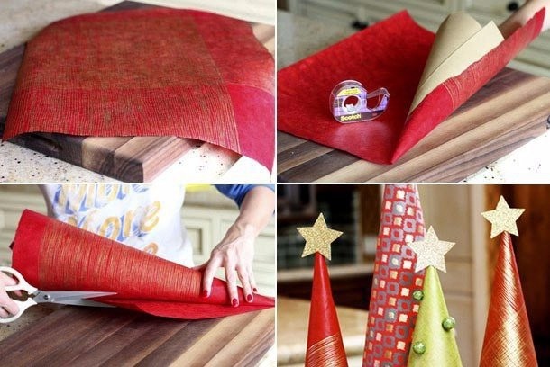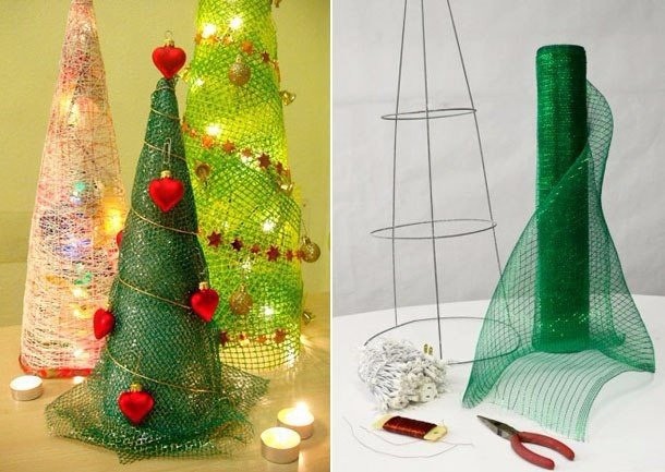 Новогодние елочки своими руками могут быть сделаны как на основе картона, так и на каркасе из проволоки.