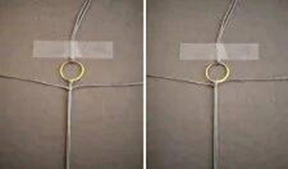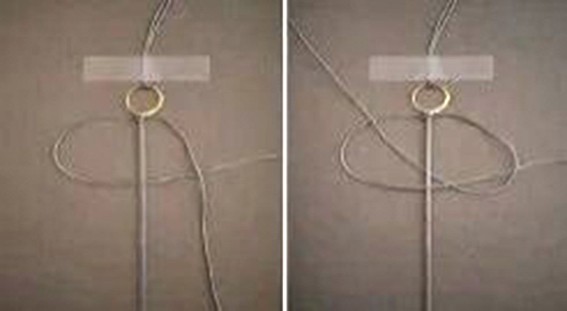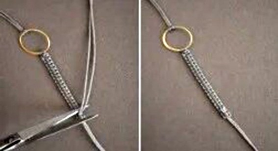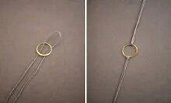 Разрезаем нитку на отрезки: 2 по 70 см, 2 по 50 см и один 25 см. Складываем отрезок нитки 50 см пополам и крепим его к фурнитурному элементу. То же повторяем и с другой стороны элемента. Берём отрезок нитки 70 см, складываем пополам и делаем воздушную петлю, обхватываем ею отрезок 50 см. Левую сторону 70 см отрезка закидываем на правую и продеваем вовнутрь. Делаем узел. Теперь делаем воздушную петлю с другой стороны. На этот раз закидываем сверху правую сторону. У нас получается узел. Продолжаем плетение: влево, вправо, влево, вправо.