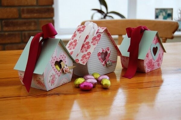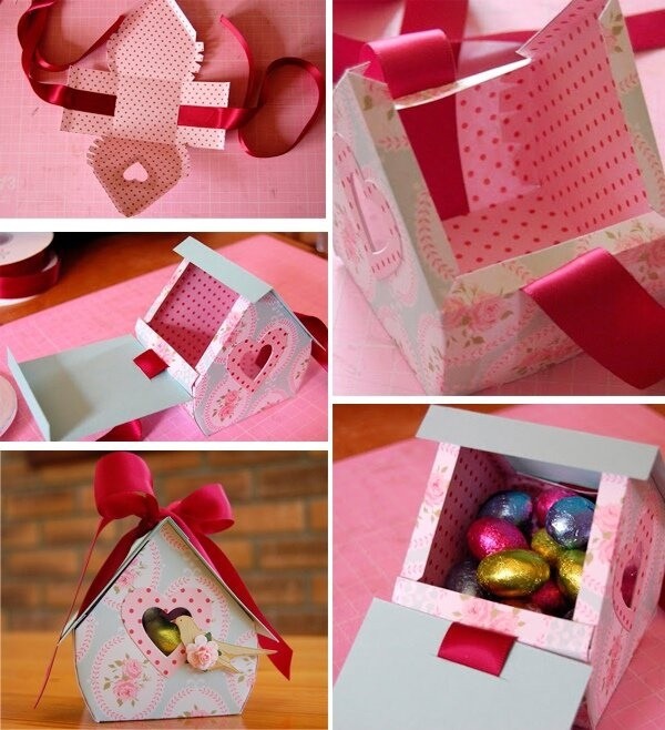 Необходимо распечатать на красивой бумаге, представленный ниже шаблон. В крайнем случае, Вы можете попробовать его перерисовать от руки. Затем заготовку необходимо вырезать и подогнуть по всем пунктирным линиям. В донышке коробки нужно создать канцелярским ножом две прорези, в которые следует вставить ленту. Осталось склеить домик, вырезать из подходящей по тону бумаги два прямоугольника для крыши, подогнуть каждый из них по 1 см., а также в каждом из них сделать прорези (см. фото). В данные прорези вставить ленточку, уложить внутрь подарок, и завязать ленту сверху в виде бантика.