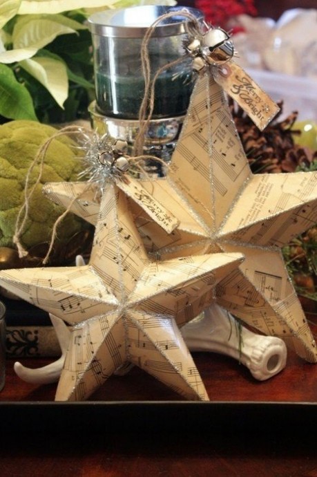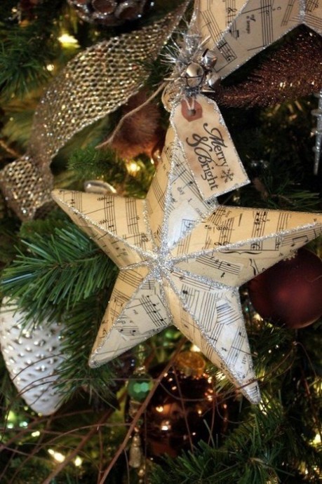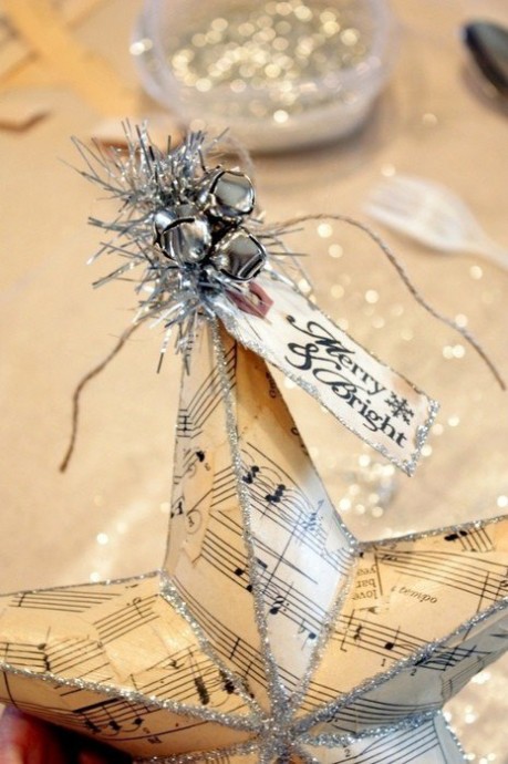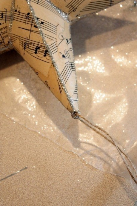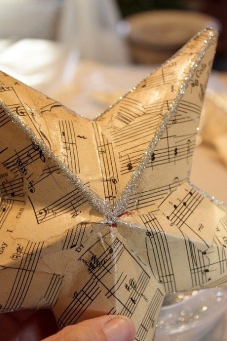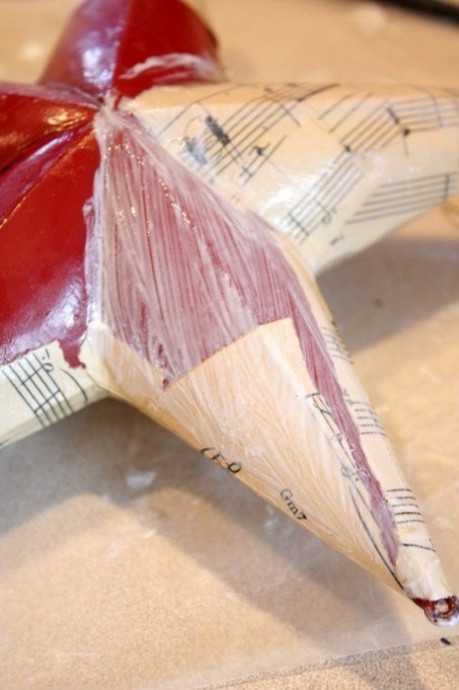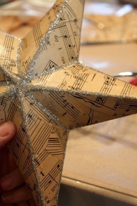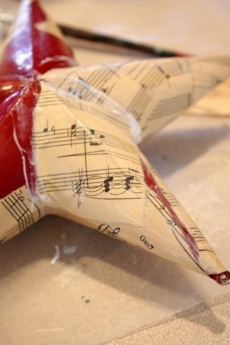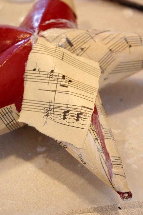 Музыкальная звезда на ёлку делается в технике декупажа.
