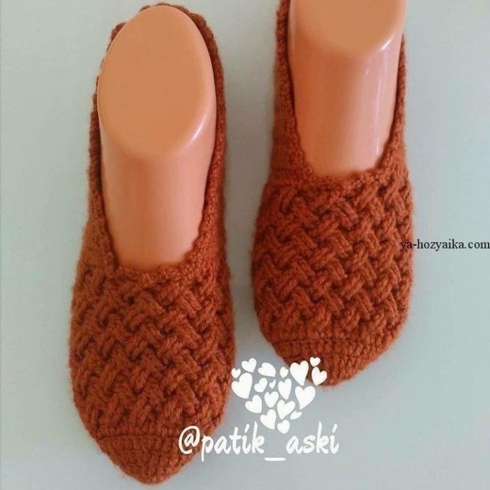 У меня есть описание на поворотные ряды. Если помудрить, можно придумать, как вязать по кругу. Или вязать так, а потом сделать аккуратный шов на подошве. А дальше сбн или сн до нужной длины. Набираем цепочку из воздушных петель необходимой нам длины. 1-й ряд вяжем просто столбиками с двумя накидами. 2-й ряд: 4ВП, две петли основания пропускаем, далее вяжем два рельефных столбика с двум накидами. Для этого делаем два накида, вводим крючок под тело столбика предыдущего ряда, вытягиваем рабочую петлю подлиннее и провязываем петли поочередно вместе. Аналогично вяжем второй рельефный столбик. Следующие два столбика с двумя накидами вяжем, вводя крючок под тело первого и второго столбика предыдущего ряда, т.е. возвращаемся к началу вязания ряда. При этом связанные столбики будут перекрывать сверху первые два связанных столбика. Пропускаем следующие две петли основания, 2 рельефных С2Н, затем 2 рельефных С2Н на двух предыдущих столбиках. Таким образом продолжаем вязать весь ряд. Еще раз повторю: сначала вяжем рельефные столбики под 3-й и 4-й столбик предыдущего ряда, затем под 1-й и 2-й. В конце ряда вяжем один С2Н в последнюю петлю основания. Вот так и получаются перекрещенные столбики. Поворачиваем вязание. 3-й ряд: 2ВП для подъема, далее вяжем столбиками без накида, вводя крючок последовательно в каждую петлю основания (т.е. как при обычном вязании крючком). Так же вяжем все нечетные (изнаночные) ряды. 4-й ряд: вяжем аналогично 2-му, но столбики должны получиться перекрещенными снизу. В начале ряда 4ВП, 2 обычных столбика без накида, 2 петли основания пропускаем, 2 рельефных С2Н. При вязании следующих перекрещенных столбиков крючок вводим под тело сначала 3-го столбика предыдущего ряда, при этом он должен идти под только что связанными рельефными столбиками, вытягиваем петлю и провязываем вместе с накидами, находящимися на крючке. Вяжем второй перекрещенный рельефный столбик. Далее при вязании мы чередуем рисунок то по описанию 2-го ряда, то 4-го. Получаем в одном ряду перекрещенные сверху столбики, а в другом — перекрещенные снизу. Так же можно вязать не перекрещенными столбиками, а связать отдельно длинные полоски из воздушных петель, которые затем переплести. Далее продолжается одним полотном.