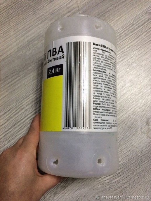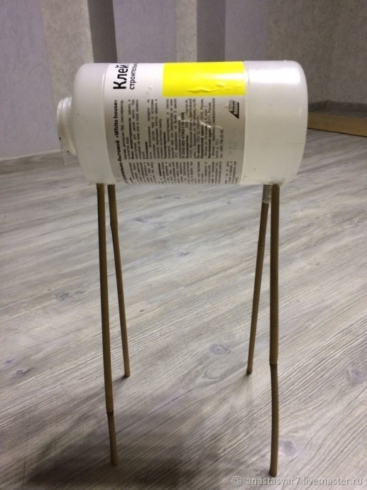 Берем бамбуковые палочки, отрезаем нужную нам длину, у меня они получились по 40 см. В банке из под клея ПВА делаем 4 отверстия и вставляем готовые ножки оленя, закрепляем с помощью горячего клея.