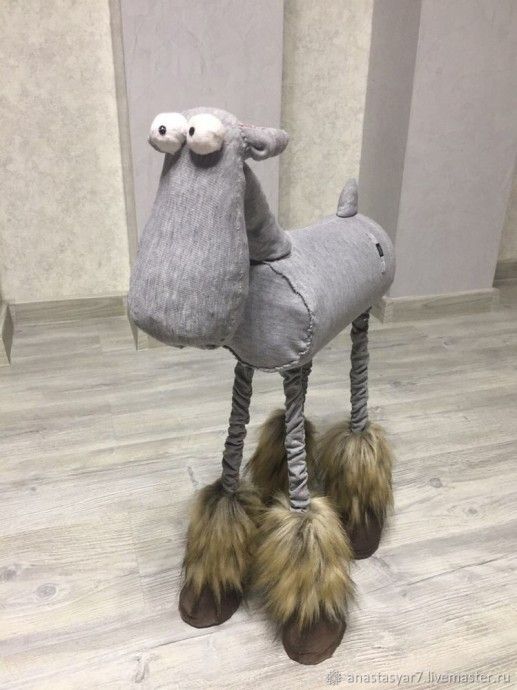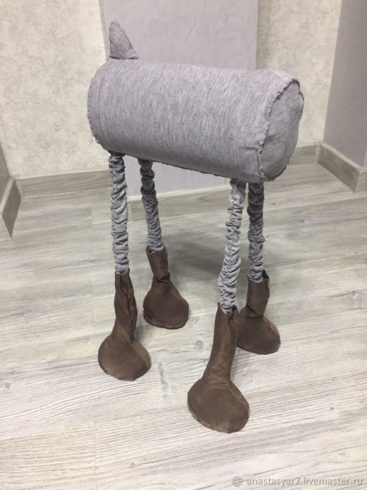 Приступаем к изготовлению мордашки. Сшиваем ее и набиваем либо материалом, либо ватой в общем тем, что у вас будет под рукой. Пришиваем ушки (их я не набивала ни чем) и пришиваем голову к шее, а уже шею к нашей конструкции.