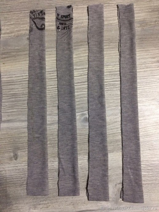 Отставляем не надолго нашу конструкцию вооружаемся ножницами, ниткой, иголкой и начинаем шить. Сначала я вырезала 4 полоски примерно по 45 см. Сшиваем их с двух сторон и делаем небольшую сборку.