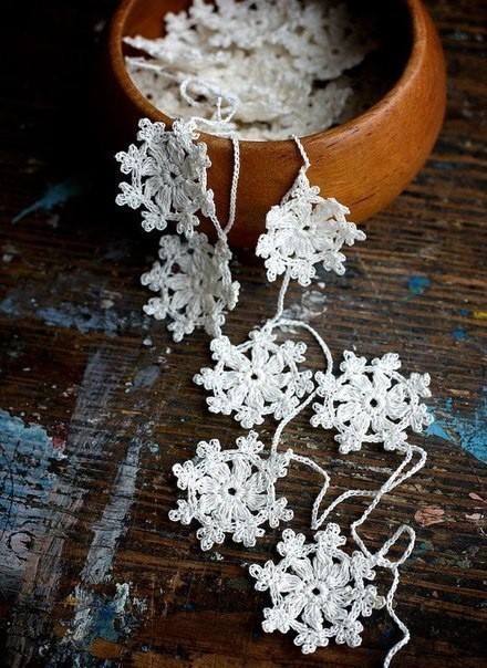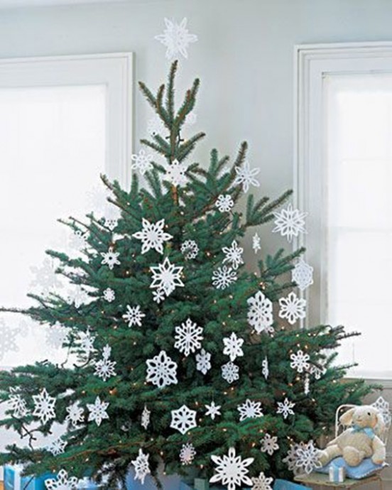 Если всю новогоднюю ёлочку украсить только вязаными снежинками, то получится очень стильно и красиво.