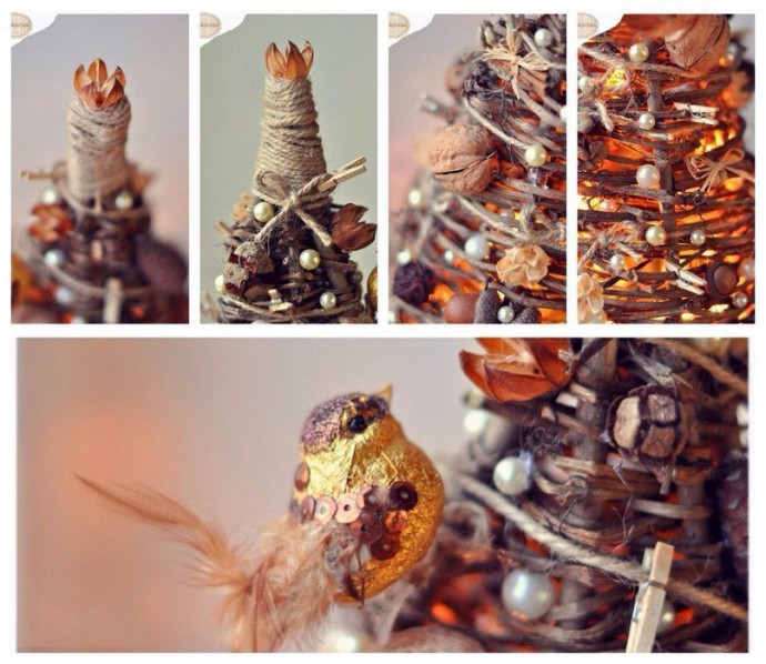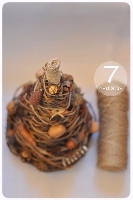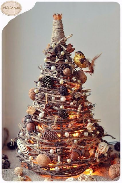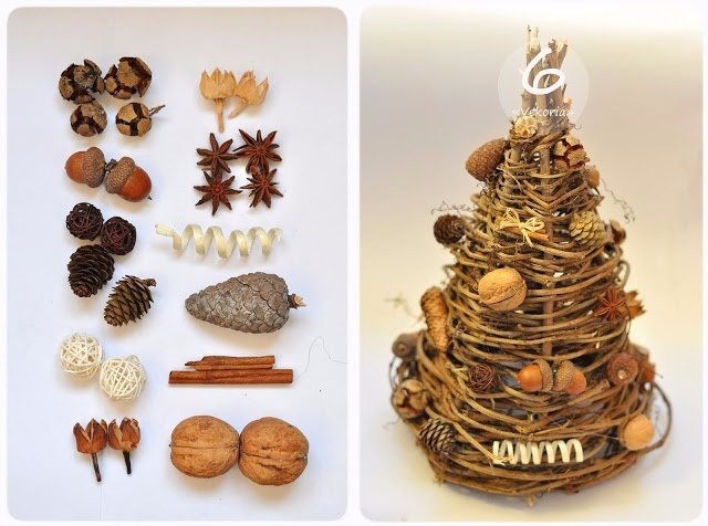 Дизайнерская ёлочка к новому году создаётся из веточек, шишек, желудей, орехов и даже звездочек бадьяна.