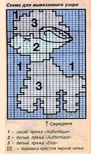 Вывязанный узор: вязать лицевой гладью по схеме. На схеме даны лицевые и изнаночные ряды. 1 клетка = 1 п. Каждый цветной участок вязать от отдельного клубка и при смене цвета нити на изнаночной стороне работы перекрещивать.