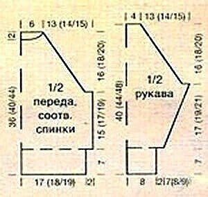 Рукава: набрать синей нитью 28 п. и вязать 7 см резинкой 2, при этом в последнем ряду равномерно прибавить 8 п. = 36 п. Продолжить работу лицевой гладью, при этом для скосов прибавить с обеих сторон попеременно в каждом 2-м и 4-м р. 10 раз по 1 п., затем в каждом 2-м р. 1 раз 1(3 раза по 1/ 5 раз по 1) п. = 58(62/66)п. На высоте 24(26/28) см выполнить регланные линии, как на спинке, затем закрыть оставшиеся 14 (16/16) п. = 40(44/48) см от нижнего края.