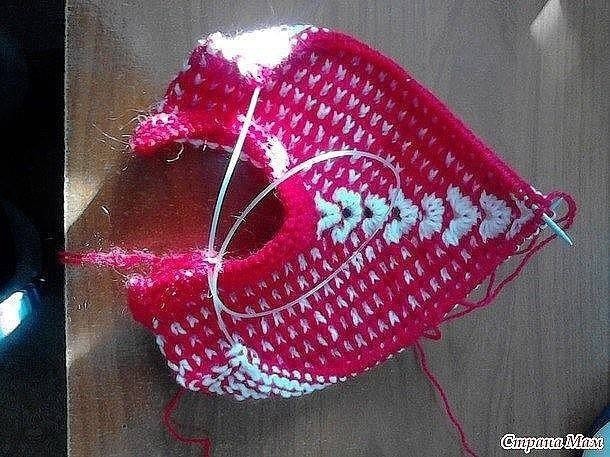 Теперь сшиваем задник. Не забываем связать вторую.