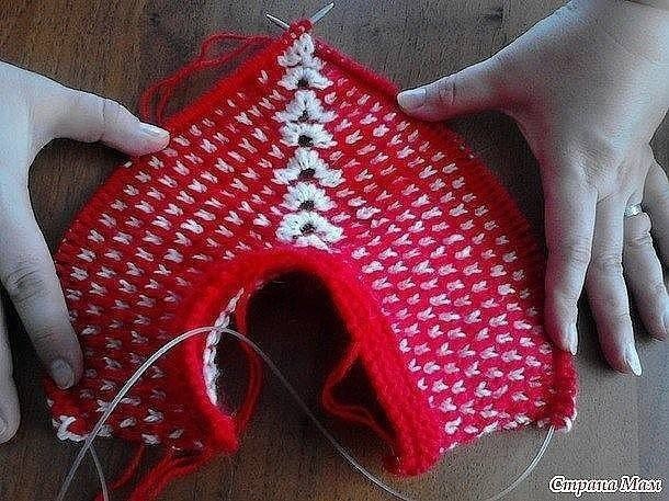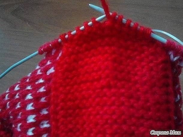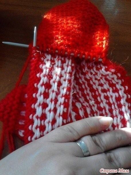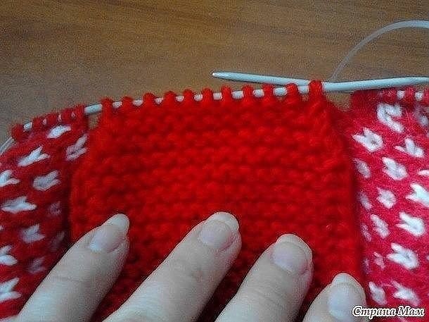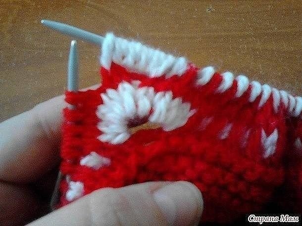 Идем до конца ряда так же ленивым узором. По изнанке вяжем по рисунку - красные петли просто снимаем (нить уже ПЕРЕД работой), белые провязываем. "Веер" провязываем 9 изнаночных петель. Переворачиваем вязание и вяжем основной нитью 2 ряда чулочной вязкой.