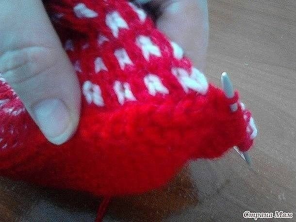 Что имеем на спицах? 5 петель боковины, 5 петель подошвы, средняя 6-ая петля с торчащей ниточкой еще 5 петель подошвы и еще 5 петель боковины. Теперь с левой стороны от центральной петли закрываем петли так: в последнюю петлю подошвы протягиваем первую петлю левой боковины вот так: поворачиваем и теперь уже в петлю боковины протягиваем петлю подошвы так закрываем одну в одну все петли левой боковины, а последнюю протягиваем в петельку с "хвостиком"