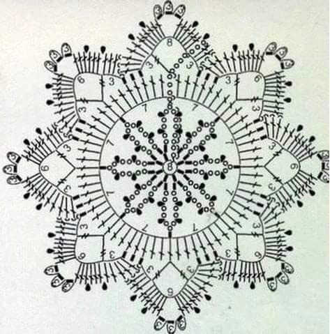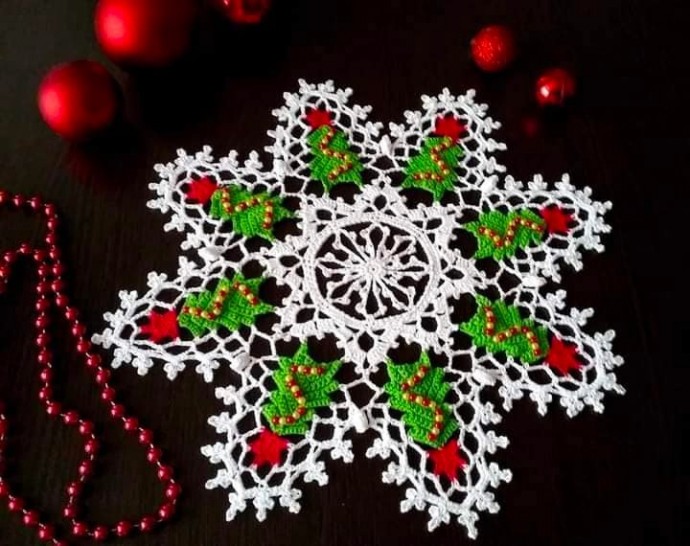 Новогодняя салфеточка выполнена в форме Рождественской звезды и дополнена тремя цветами пряжи.