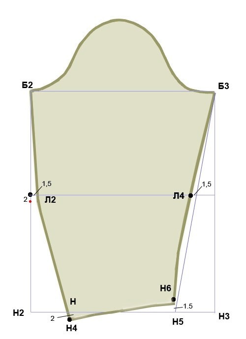 Для построения чертежа одношовного узкого рукава использовались следующие мерки: полуобхват груди - 48см; длина рукава - 60см; ширина (обхват кисти) рукава - 22см. Здесь уже требуется три мерки.Точка Л2. Разделите отрезок Б2Н2 пополам (красная точка) и отступите 2см (черная точка). Вправо отложите 1,5см и поставьте точку Л2. Точка Н у нас уже найдена (см. верхнюю выкройку), поэтому проводя через нее линию добавьте еще 2см и поставьте точку Н4. Левая часть выкройки рукава закончена.От точки Н вправо отложите ширину рукава (22см) и поставьте точку Н5, соедините ее с Б3. В месте пресечения с горизонтальной линией отложите влево 1,5см и поставьте точку Л4.Пометьте точку Н6 (от точки Н5 вверх 1,5см). Обведите контур зауженного рукава и можете вырезать ножницами выкройку зауженного книзу одношовного рукава.