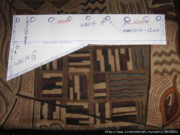Шаг 4: Поворачиваем наш ламбрекен лицевой стороной наверх. Утюжим и делаем разметки для установки люверсов. От верхнего края отступаем вниз 1см. Находим центр и обводим внутреннюю сторону люверсы. Затем устанавливаем люверсы влево и вправо от центральной. Расстояние между центрами люверсов 40 см. Как правильно установить люверсы, надеюсь вы знаете. (Для тех, кто это будет делать впервые, я советую посмотреть мастер-класс по установке люверсов на этом же сайте) После того, как все люверсы установлены, берём косую бейку, сворачиваем пополам и сшиваем. Из неё мы будем делать завязки, которыми будем крепить наш ламбрекен на карниз. Сколько метров вам её нужно, вы определите сами. Разрезаем сшитую косую бейку на равные части - всего нужно 11 шт. (по длине которую вы сами определите) Концы нужно слегка опалить, чтобы не осыпались. Теперь каждый отрезок косой бейки нужно поместить в люверсу и завязать свободной петлёй на круглом карнизе. И так все люверсы, делая петли одинаковыми по размеру. Затем поправляете руками наш ламбрекен, выдерживая одинаковое расстояние между петлями. Вот и всё!!! Желаю всем успехов.