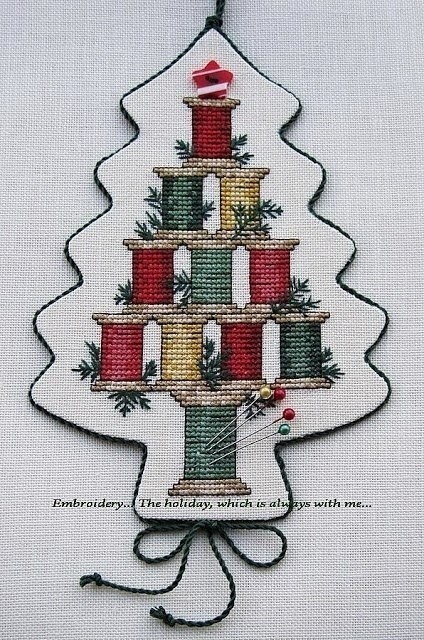 Только истинной рукодельнице придет в голову вышить ёлочку из катушек ниток.