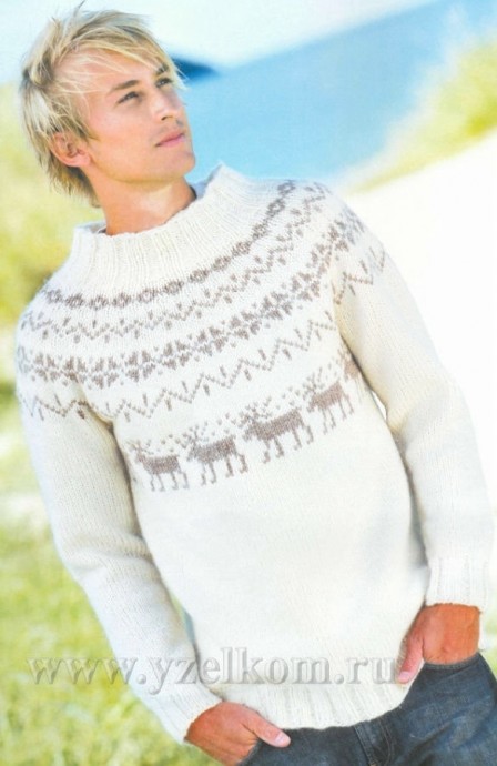 Направление вязания - снизу вверх. Спинка/перед. Набрать 150-165-180-195 п. на круговые спицы и вязать цветом 1 резинкой (3 лиц. п. х 2 изн. п.) в высоту 6 см. Далее продолжить вязать лиц. гладью. Когда высота достигнет 37-38-39-40 см, продолжить вязать по схеме А, рисунком "олени". В следующем ряду разделить вязание на 2 части для переда и спинки: закрыть первые 8 п. для проймы, провязать 67-75-82-90 п. спинки, закрыть след. 8 п. и провязать 67-74-82-89 п. переда. Отложить работу и связать рукава.