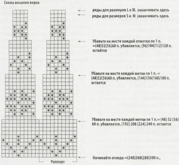 Снять все отложенные петли на круговые спицы, рукава - на места для пройм рукавов = 240-261-282-303 п. Начать с петель спинки и провязать всеми петлями 4-5-6-7 рядов лиц. гладью цветом 1. Убавить за 1-й ряд через одинаковые расстояния 0-1-2-3 п. = 240-260-280-300 п. Продолжать вязание рисунка, делая убавления по схеме = 96-104-112-120 п. Затем провязать 1 лиц. ряд цветом 1, убавляя равномерно 21-24-27-30 п. = 75-80-85-90 п. Провязать еще 7-7-8-8 см резинкой воротник. Петли закрыть.