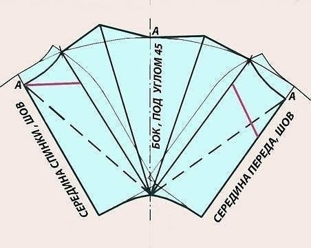 Внутреннее ребро складки отмечаем пунктиром. Замеряем его длину. И увязываем все ребра складок по длине. Обратите внимание, что для передней и задней половинки, линия верха юбки не одинакова.