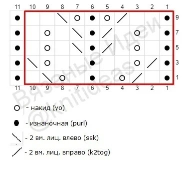 9 ряд: кром, *1 изн, 2 лиц, 2 вм. лиц.вправо, накид, 1 изн, накид, 2 вм. лиц. влево, 2 лиц*, 1 изн, кром.