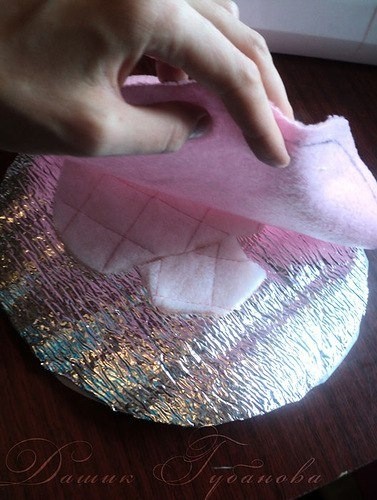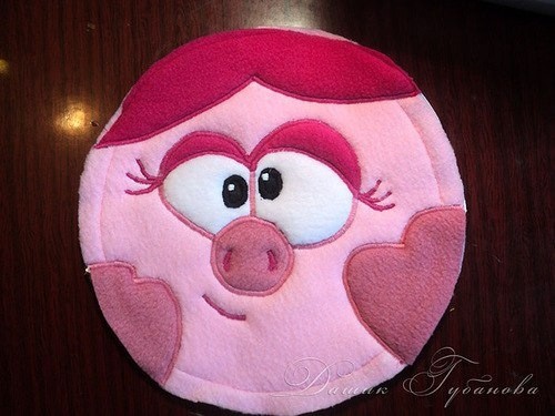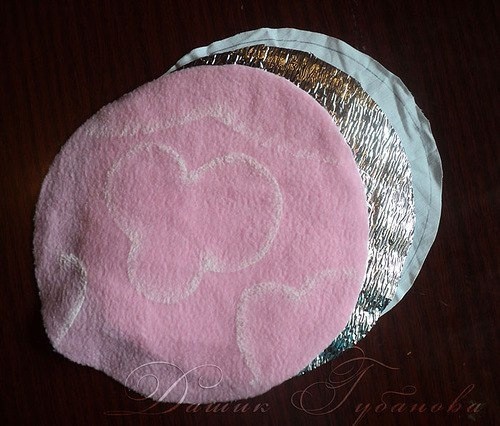 Также нам понадобиться окружность диаметром 25 см. Вырезаем из светло розового флиса 2 окружности. Не забываем оставлять припуски на швы. Из вспененного полиэтилена так же вырезаем две окружности с тем же диаметром. И из бязи - две окружности Между флисом и вспененным полиэтиленом можно положит кусочек поролона или синтепона. В область глаз и носа, чтобы придать им объем.