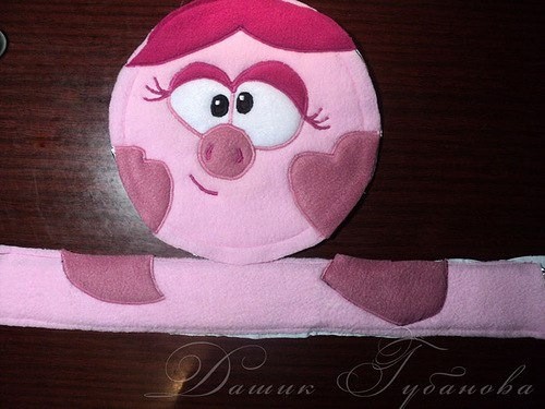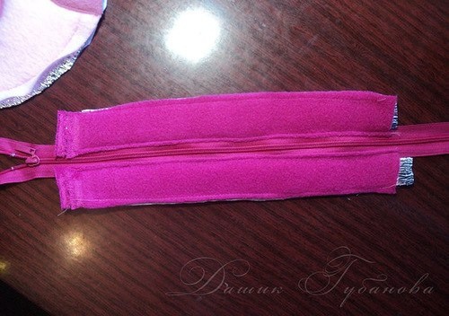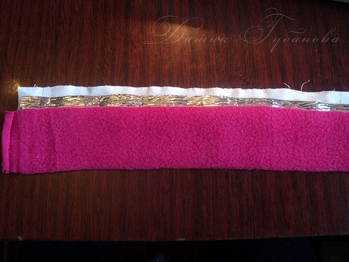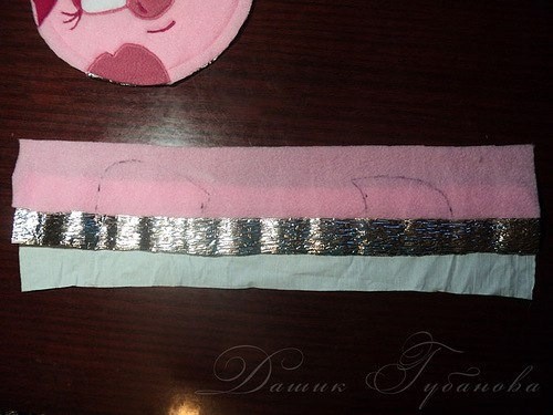 Теперь вырезаем две полоски размером 26 см x 2,5 см из темно-розового флиса, вспененного полиэтилена и бязи. С припусками на швы. (26 см - измеряется длина по окружности, темно розовой части - от волос до волос).