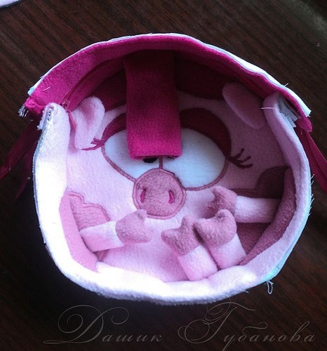 Вырезаем полоску 54 см x 6 см из светло-розового флиса, вспененного полиэтилена и бязи. С припусками на швы. (54 см- измеряется длина по окружности, светло розовой части - от волос до волос. 6 см - толщина рюкзака)