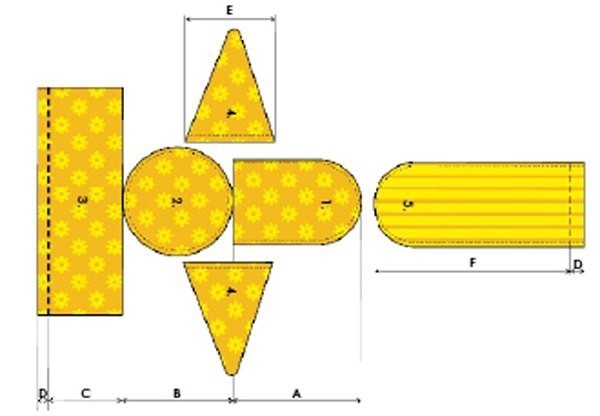 Детали № 1, 2, 3 и 4 выкраиваем из материала в цветочек (деталь №4 – четыре раза), а деталь №5 – из материала в полоску. Пары деталей №4 сшиваем с левой стороны, отглаживаем швы. Выворачиваем их на правую сторону и снова утюжим. Получились треугольные завязки банта. Сшиваем оставшиеся детали, отглаживаем чехол для стула и обрабатываем нижний шов.