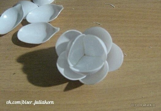 Второй шаг – создаем первый круг лепестков, склеивая три маленькие ложечки между собой при помощи термопистолета.
