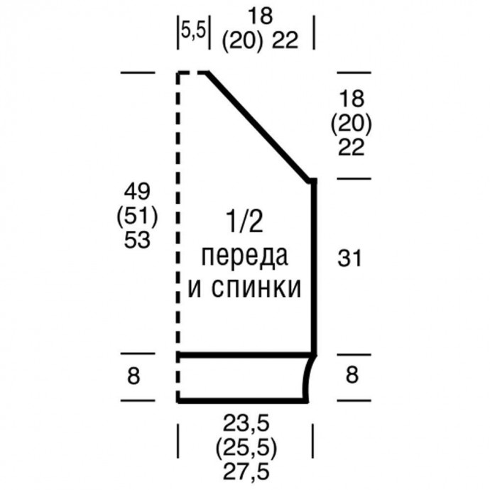 Через 31 см = 68 рядов от планки продолжить работу для пройм следующим образом: выполнить 1 раз 69—72-й ряды схемы = 131 (143) 155 п., затем выполнить 8 (9) 10 раз 73—76-й ряды.