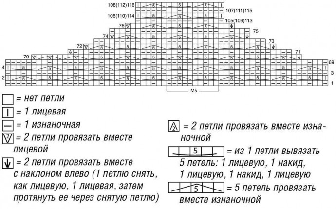 Через 47 см = 104 ряда (49 см = 108 рядов) 51 см = 112 рядов от планки связать на оставшихся 35 п. 4 ряда по прямой, для этого выполнить 1 раз 105—108-й ряды (109—112-й ряды) 113—116-й ряды схемы.