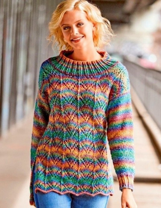 Зубчатый ажурный узор очаровательного джемпера с боковыми разрезами великолепно смотрится в пряже секционного крашения.