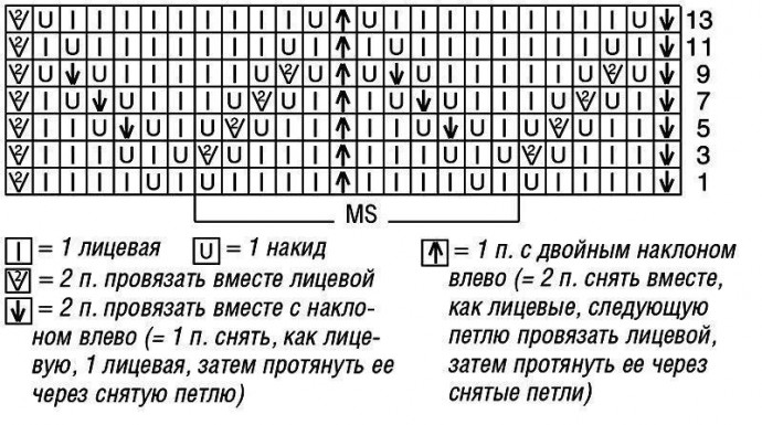 Число петель кратно 12 + 1 + 2 кромочные = вязать согл. схеме. На ней даны лицевые ряды. В изнаночных рядах все петли и накиды провязывать изнаночными. Начать с 1 кромочной и петель перед раппортом, раппорт постоянно повторять, закончить петлями после раппорта и 1 кромочной. Постоянно повторять 1—14-й ряды.