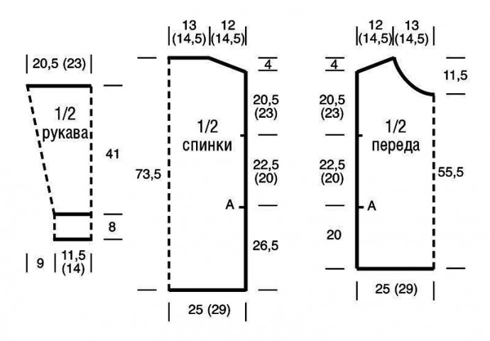 Вязать, как спинку, но с горловиной и меньшей длины. Для этого с обеих сторон выполнять узор 2 до высоты 20 см = 42 ряда от начального ряда (= отметка A на выкройке).