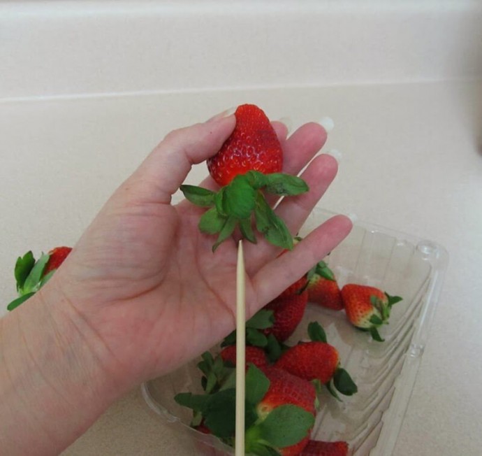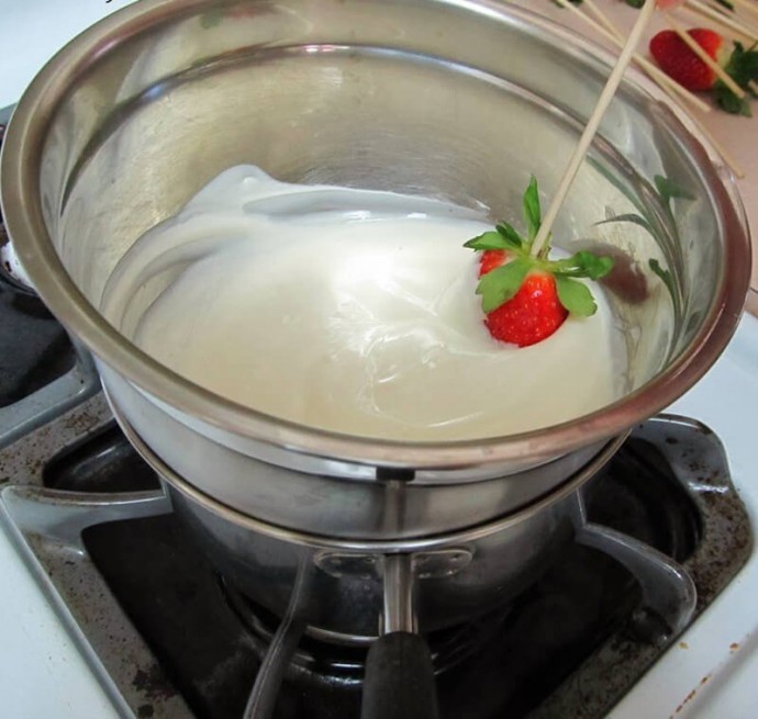 Растапливаем шоколад на водяной бане, затем насаживаем свежую клубнику на шпажки и окунаем в шоколад.