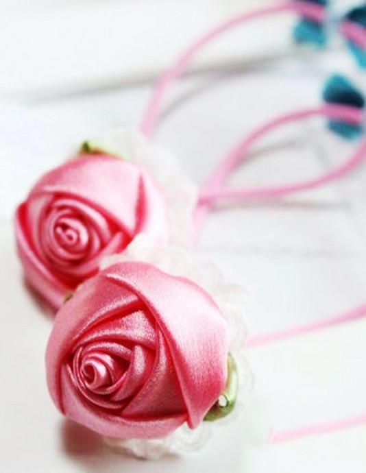 Нежнейшие розочки из атласной ленты готовы украсить резинки для волос, ободки, подхваты для штор и другие вещи.
