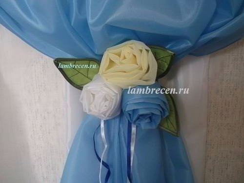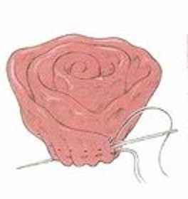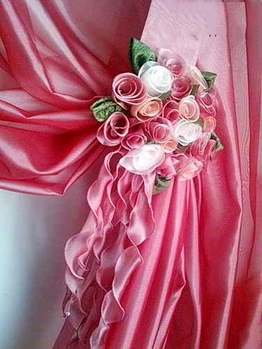 Прошейте вручную наметочными стежками нижний необработанный край полосы включая закругленные края, отступая 6 мм от края. Натяните нить на одном конце полосы и постепенно начинайте сворачивать цветок розы из ткани, закрепляя низу вручную произвольными стежками Бутон розы из ткани сворачивается так же, как и цветок, но поплотнее ( меньше сборки) и в конце делается сборка побольше, для того, чтобы сделать вид, что лепестки бутона начали раскрываться.