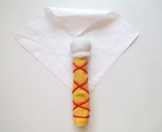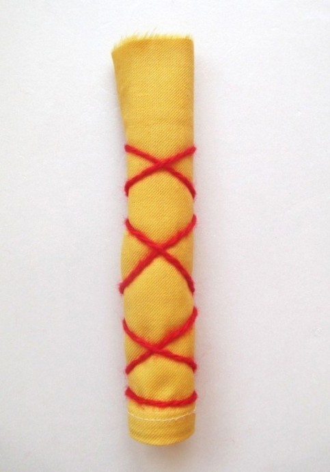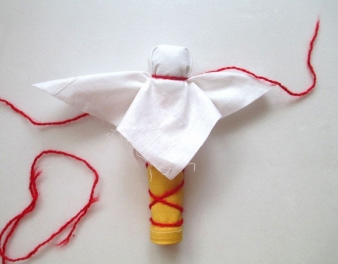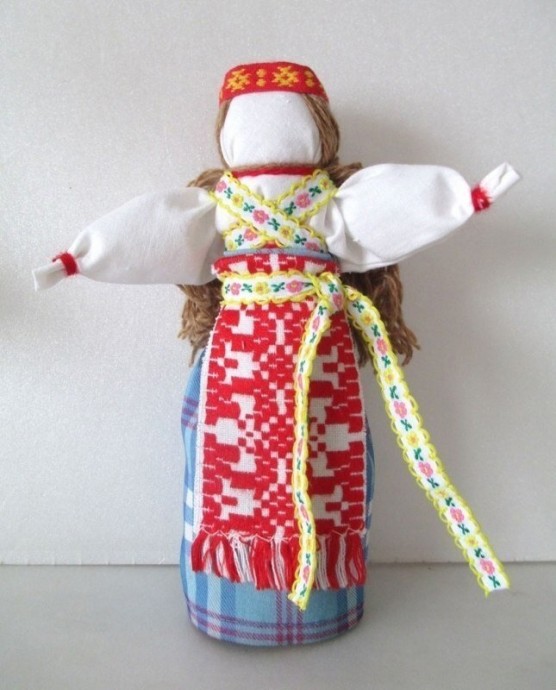 Ткань для тулова 18 на 30 или 50 см в зависимости от плотности ткани (чем тоньше ткань, тем длиннее лоскут, скрутка в основании должна быть 2-3см). Немного синтепона или ваты для головы. Белый лоскут для головы и рук 20 на 20 см. Цветной лоскут для юбки. Лоскут для передника. Нитки для волос желаемой длины и цвета. Красные нитки для обвязок. Тесьма для пояса и для волос.